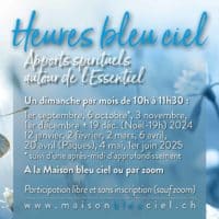 Une Heure bleu ciel, c’est un moment à vivre comme une expérience intérieure. Au programme : méditation, chants, silence et un éclairage spirituel autour de l’Essentiel. Ce temps de ressourcement est animé par Nils Phildius. Vous avez deux possibilités pour participer à cette Heure Bleu Ciel : L’heure bleu ciel est gratuite. Nous vous invitons Lire plus …