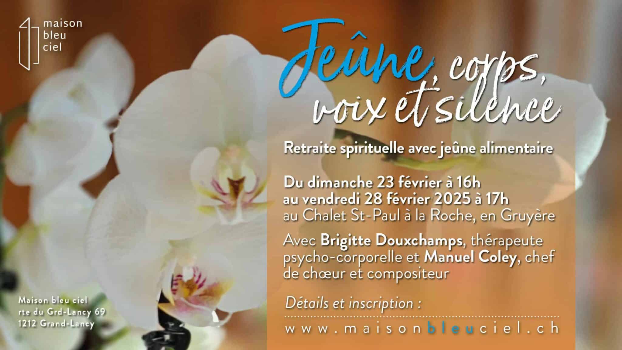 Chalet St-Paul, la Roche Chemin du Poyet 18, La Roche, SuisseEn cas de difficulté pour vous inscrire, n'hésitez pas à nous envoyer un mail à info@maisonbleuciel.chRetraite spirituelle avec jeûne alimentaire NB: nous n'acceptons pas de personne de plus de 65 ans n'ayant aucune pratique du jeûne