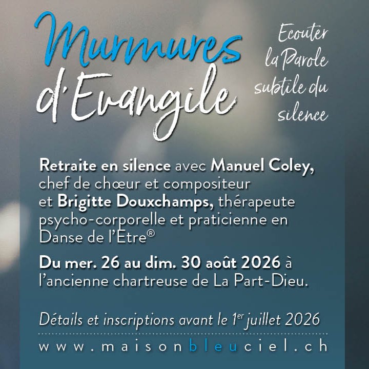 Ancienne Chartreuse de la Part-Dieu Gruyère, SwitzerlandEn cas de difficulté pour vous inscrire, n'hésitez pas à nous envoyer un mail à info@maisonbleuciel.chEcouter la Parole subtile du silence Retraite en silence avec Manuel Coley, chef de chœur et compositeur et Brigitte Douxchamps, thérapeute psycho-corporelle et praticienne en Danse de l’Etre® À l’ancienne chartreuse de La Part-Dieu (Gruyère)