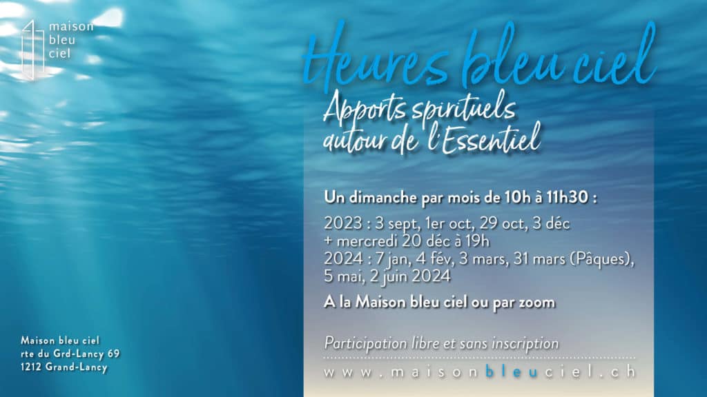 Une heure bleu ciel, c’est un temps à vivre comme une expérience intérieure, avec de la méditation, des chants, du silence et un apport spirituel autour de l’Essentiel. Elle est animée par Nils Phildius.