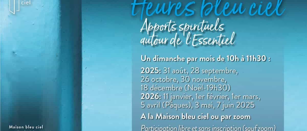 L’Heure bleu ciel est un moment privilégié pour vivre une expérience intérieure, mêlant méditation, silence, chants, réflexion spirituelle autour de l’Essentiel et échanges. Ces rencontres ont lieu une fois par mois, le dimanche, en format hybride (en présentiel et via Zoom). Participation : Les heures bleu ciel sont gratuites. Nous vous invitons à soutenir la … Lire la suite de Heure bleu ciel