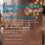 - Atelier d’écriture de l’Avent – le vendredi 12 décembre 2025 à 19hAtelier d’écriture intuitive Un temps pour s’arrêter, écouter ce qui cherche à émerger,laisser les mots venir, simples et vrais. Guidé·e par la contemplation d’un tableau,explorer ce que ce temps de l’Avent 2025 nous invite Lire plus …