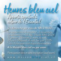 Une Heure bleu ciel, c’est un moment à vivre comme une expérience intérieure. Au programme : méditation, chants, silence et un éclairage spirituel autour de l’Essentiel. Ce temps de ressourcement est animé par Nils Phildius.