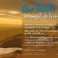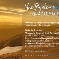 Aura lieu. Il reste encore des places. Méditer un texte accompagné-e par la respiration et la musique Série de 3 soirées Mercredis 24 avril, 8 et 22 mai 2024de 19h à 21h30 env Animation Emmanuel Mégevand, relaxologue et thérapeute psycho-corporelet Myriam Fonjallaz, ergo-thérapeute, formée à l’accompagnement spirituel. Trois variations d’une méditation à vivre et à Lire plus …