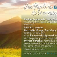 Méditer la prière du « Notre Père » accompagné-e par la respiration et la musique Série de 3 soirées Mercredis 18 sept, 2 et 16 oct 2024de 19h à 21h30 env. Animation Emmanuel Mégevand, relaxologue et thérapeute psycho-corporelet Myriam Fonjallaz, formée au théâtre en mouvement et poétique et à l’accompagnement spirituel. Trois variations d’une méditation à vivre Lire plus …
