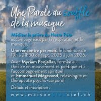 avec les mots du « Notre Père » Méditer la prière du « Notre Père » accompagné-e par la respiration et la musique Au rythme des mois, prendre le temps de l’expérience avec chacune des phrases de la prière. Laisser le souffle délier nos mots, nos discussions et nos divisions. Accueillir ce qui nous relie, s’ouvrir à la Source Lire plus …
