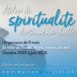 - Atelier de spiritualité – témoignages« Du nouveau » émergeant en moi Ma curiosité m’a conduite vers l’atelier de spiritualité de la Maison Bleu Ciel dont j’avais entendu parler. En automne 2024, je me trouvais en début de retraite après une carrière active et passionnante, je peinais à voir le sens dans ma vie dans cette nouvelle étape, de plus je venais Lire plus ...
