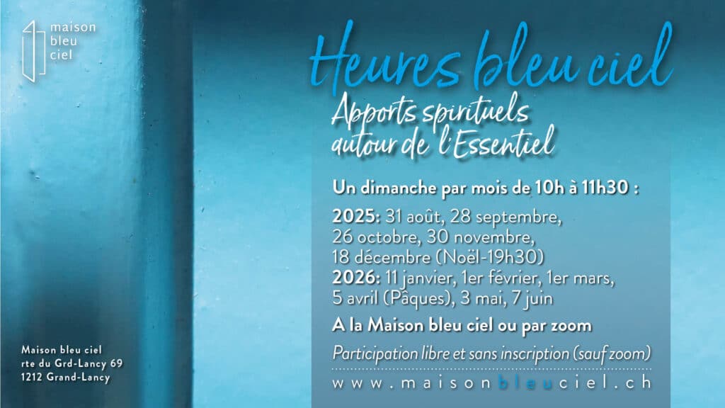 L’Heure bleu ciel est un moment privilégié pour vivre une expérience intérieure, mêlant méditation, silence, chants, réflexion spirituelle autour de l’Essentiel et échanges.